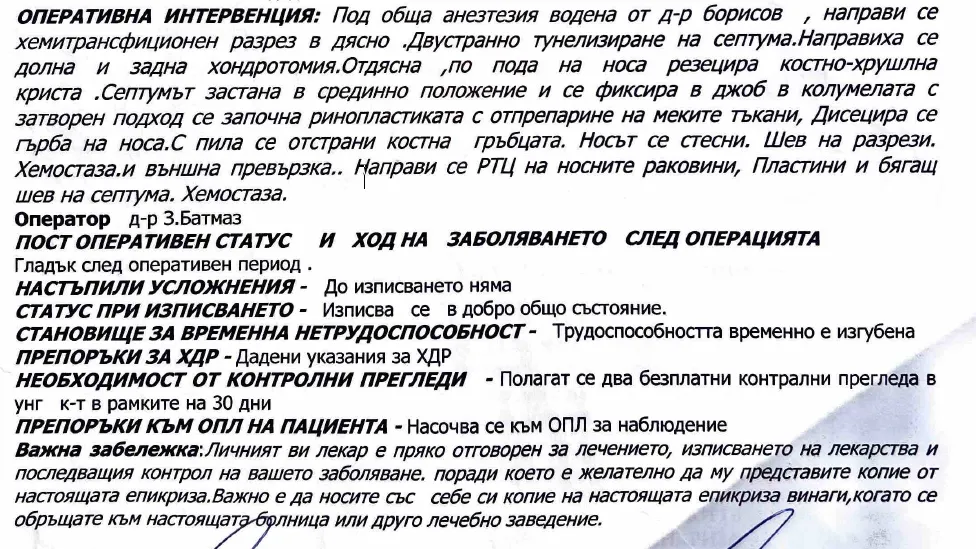 „ В превръзката ми остана кожата. С гной, с месо. Беше една ужасяваща зараза. Д-р Батмаз и доктор Серпецас са ми премахнали цялата тази структура. Те са ми отрязали всичко. Носът ми беше не безформеност. Той беше като на конче, можех по този начин да го обърна. Беше в действителност ужасно ”, споделя още тя.