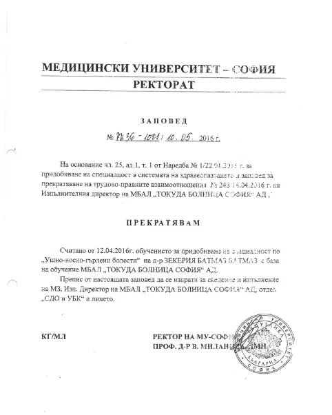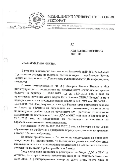 И юристите на пострадалите пациенти, и ние потърсихме отговор от Медицинския университет в София дали е издавал това удостоверение. Краткият отговор е НЕ. Пълният може да видите в документа: