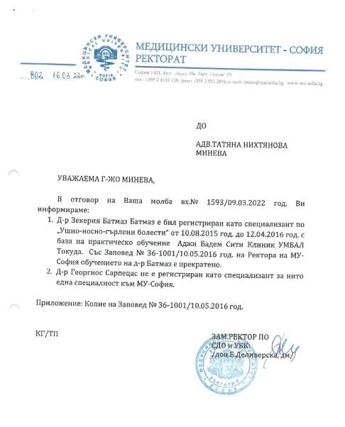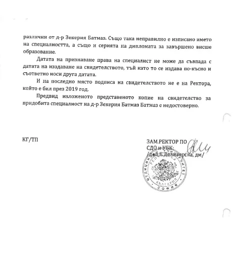 Адвокат Невена Горшкова е сезирала редица институции, че доктор Зекерия Батмаз е практикувал без същинско удостоверение. Три години след подадените сигнали обаче - от РЗИ и Изпълнителна организация „ Медицински контрол ” не са подхванали дейности.