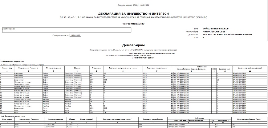 Припомняме, че организация ПИК извънредно разкри, че работещият цялостен живот на държавна работа Бойко Рашков е заможен магнат и има цели 19 парцели, измежду които имение с 12 тоалетни в София, жилища в столичния " Лозенец ", морско притежание в Несебър, вила в Стара планина и други.