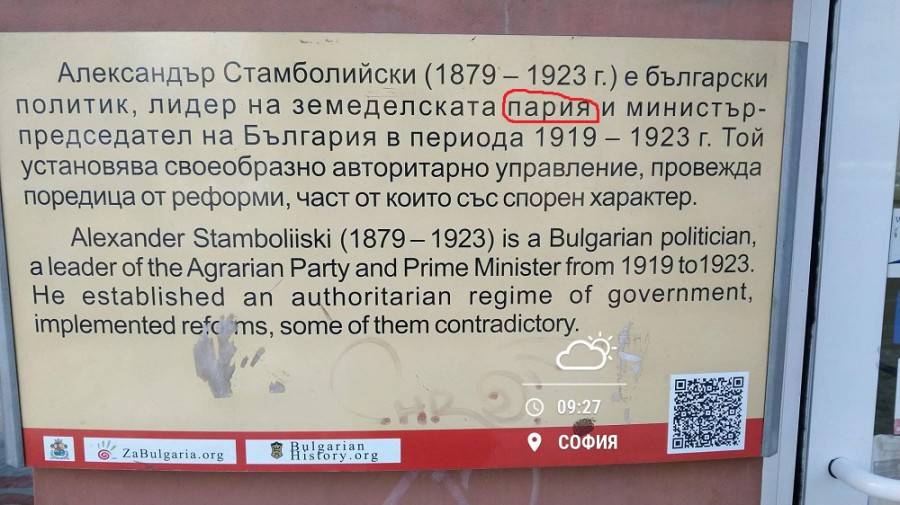 Възпоменателна табела за това кой е Александър Стамболийски е написана с груба правописна неточност. Това се вижда от фотография, оповестена във Фейсбук групата " Безумията в София ".