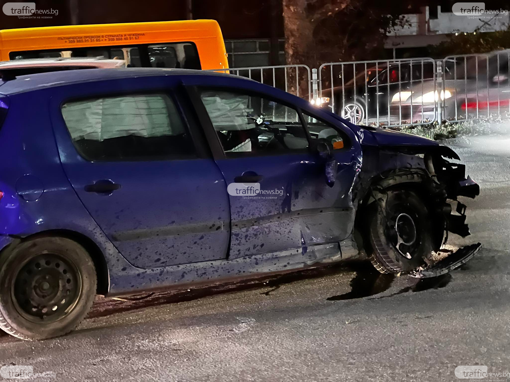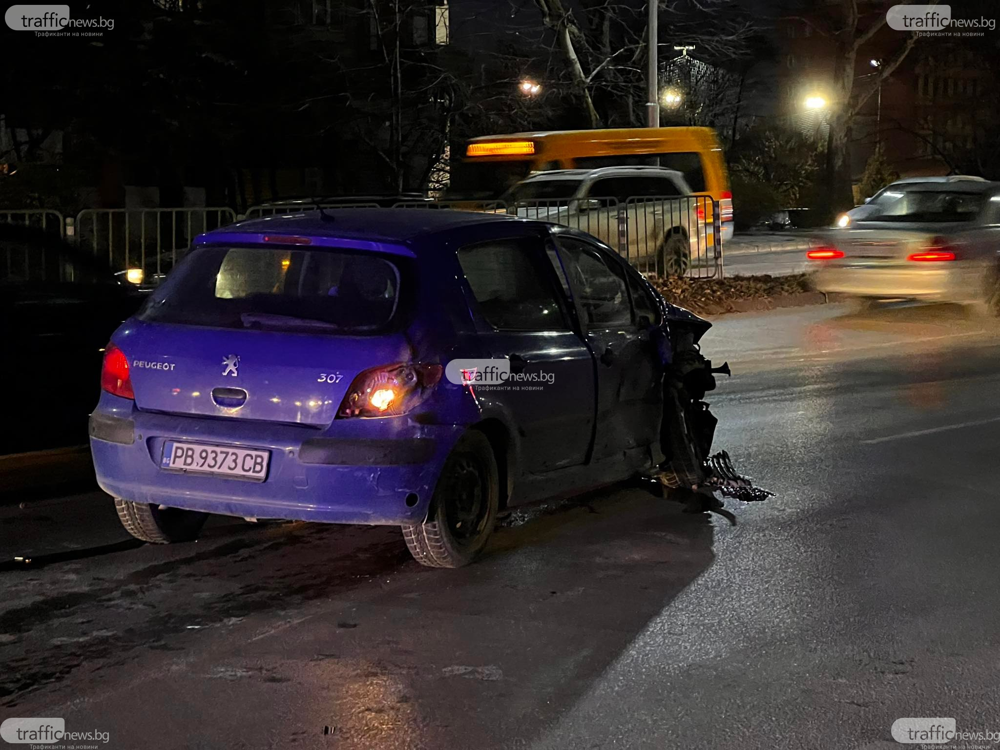 Мъжът е карал синьото пежо в посока Пловдив и правил противоположен завой, когато в отсрещното платно се задава мерцедес, каран от юноша, който удря пежото, завърта се и се забива в светофарната уредба, която е развалена.