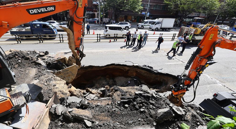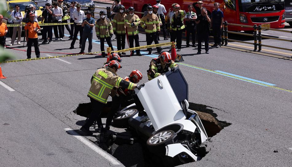 Възрастна двойка е била откарана в болница, откакто колата, в която са били, е пропаднала в дълбока дупка. Инцидентът е станал в Сеул, Южна Корея.