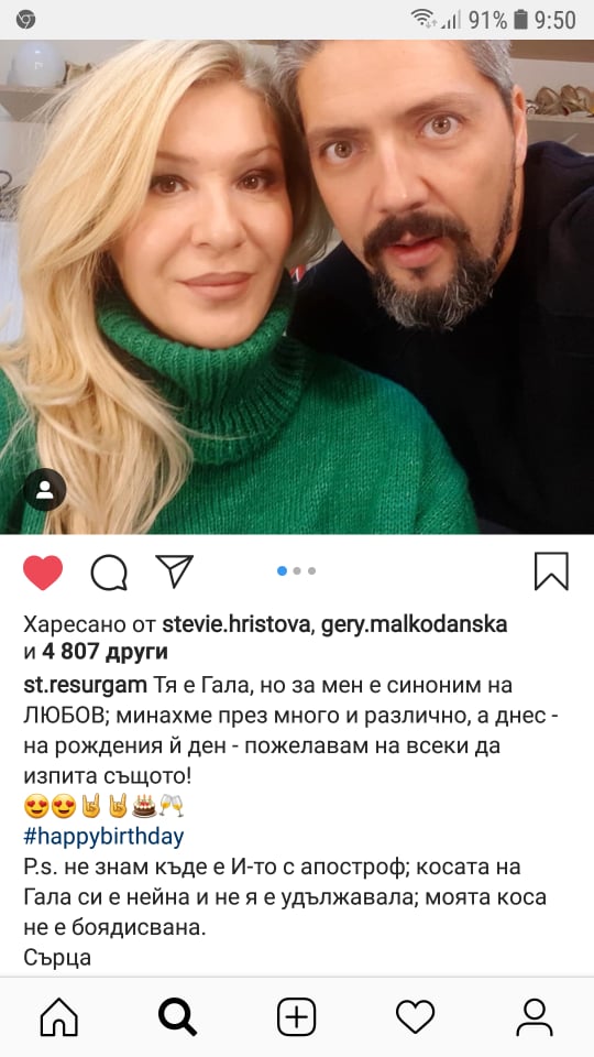 " Тя е Гала, само че за мен е синоним на обич. Минахме през доста и друго, а през днешния ден - на рождения й ден - поисквам на всеки да изпита същото! ", написа той и чуство за комизъм изясни, че " косата на Гала си е нейна и не я е удължавала, а неговата не е боядисана ".
