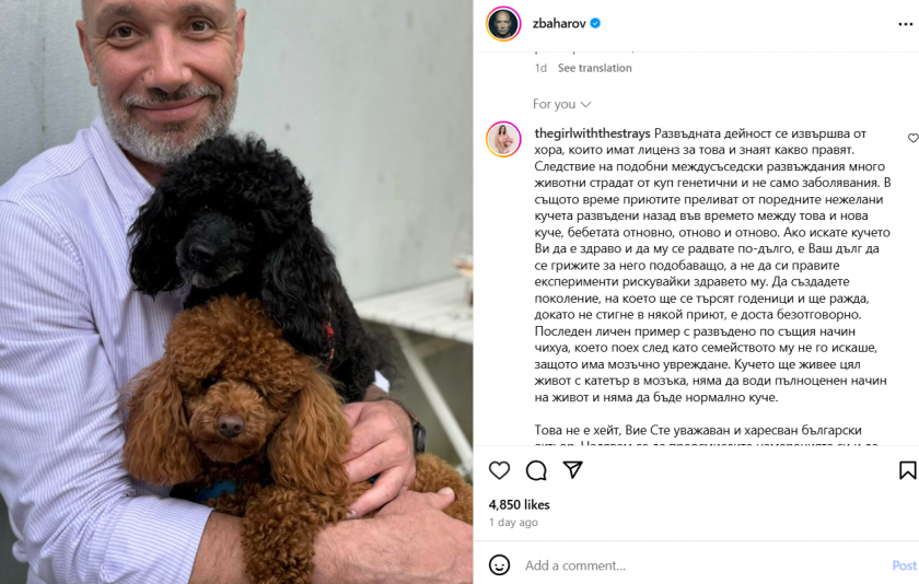 Вчера Захари Бахров показа, че търси избраница на едно от кучета си, което желае да развъди. Актьорът на секундата бе атакуван от фенове на животните тъй като счита да развъжда. Победителката от „ Ергенът 2 “ Валерия Георгиева обществено нахока по-големия брат Бахаров и му написа дълъг коментар под фотографията му с кученцата в инстаграм.