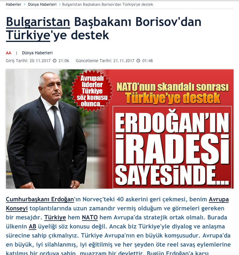 Според медията министър-председателят ни е " похвалил " протеста, който Анкара разгласи на НАТО. Sabah " Сабах " е още по-категоричен в своето заглавие: " Българският министър председател Борисов поддържа Турция ".
