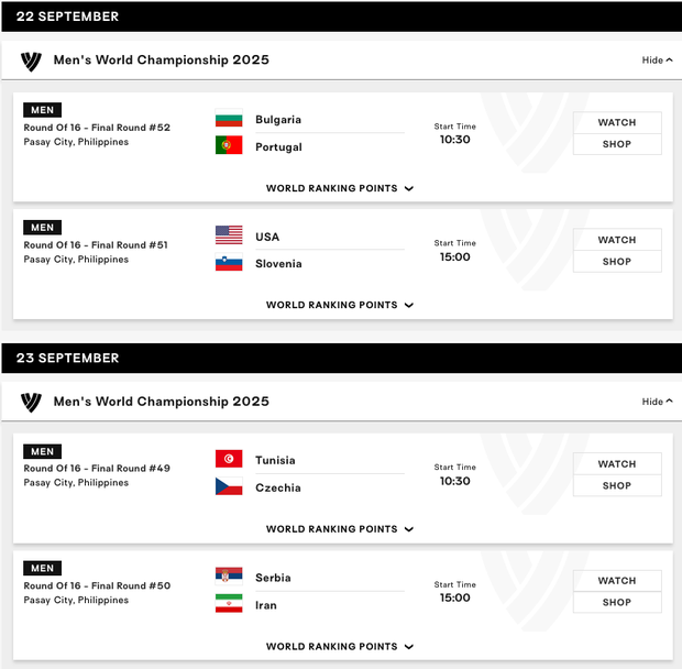 Вече е изцяло ясна програмата на всички дуели от 1/8-финалите на Световното състезание по волейбол за мъже във Филипините (Пасай Сити).