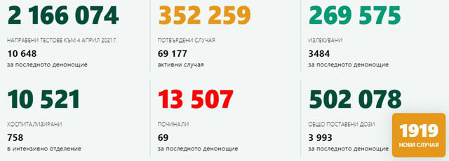 Поставените у нас дози от имунизациите против новия ковид все още са 502 078. През последните 24 часа са сложени 3 993 от тях. Според Националната осведомителна система медицинските чиновници, при които е установена коронавирусна зараза у нас, са общо 12 129. Новите случаи, регистрирани през миналото денонощие, са 37. Починалите лица, при които е била доказана коронавирусната зараза, са 13 507. Нови 69 случая са регистрирани през последното денонощие. Ден по-рано новодиагностицираните с COVID-19 у нас бяха 4013, а преди седмица, в събота - 2537.