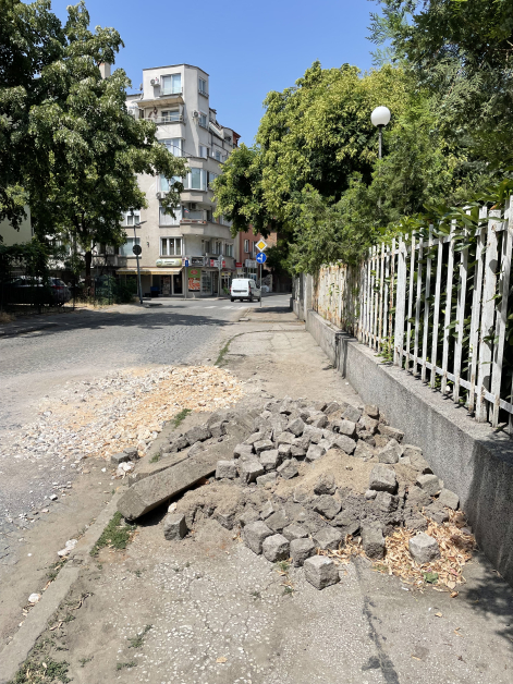 Повече от седмица обаче пътната настилка не е възобновена, а вместо това паветата са зарязани и струпани на тротоар, тъкмо до входа на детското заведение.