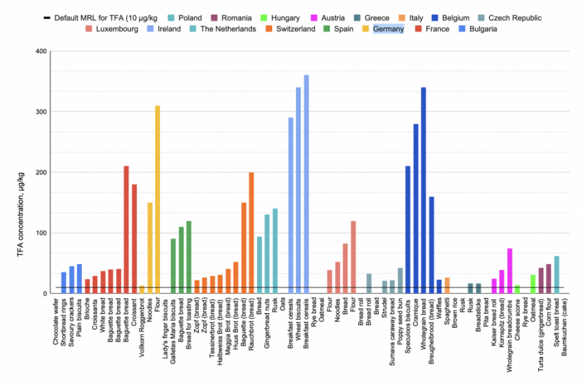 TFA е открит в 81,5% от пробите (53 от 65 проби) в 16 европейски страни, с високи равнища на замърсяване. Пшеничните артикули са доста по-замърсени от другите зърнени артикули, като междинните концентрации в тях са 100 пъти по-високи от тези в чешмяната вода. Повишено наличие на безконечни химикали има в известни сладкиши, макаронени произведения, кроасани, пълнозърнест и елементарен самун и брашно, франзели, кексове и така нататък