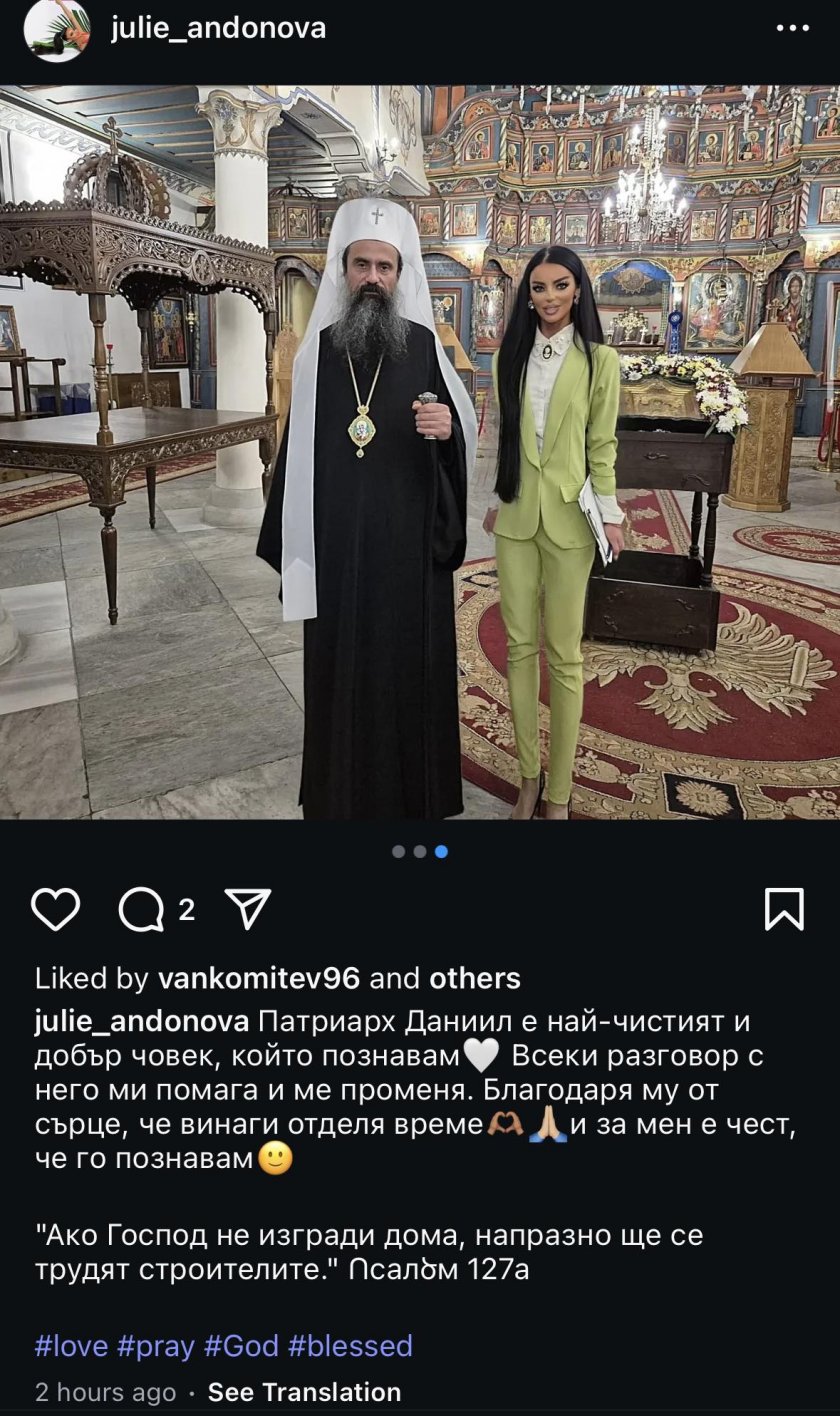 Вечно мрачният и начумерен патриарх Даниил очевидно може да се усмихва освен в наличието на съветската посланичка Елеонора Митрофанова. Снимка на Светиня му с млада, чернокоса кокона на име Джулия Андонова, се трансформира в шлагер в обществените мрежи.