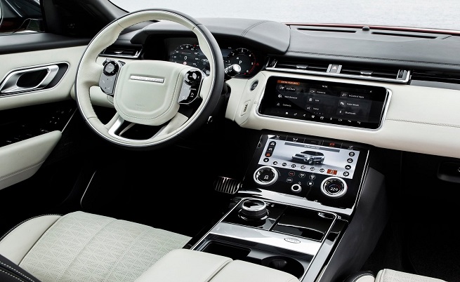 Интериорът на Range Rover Velar е гуляй за епикурейците-гаджетоманиаци. Централно място тук заемат двата 10-инчови сензорни екрана на новата информационно-развлекателна система Touch Pro Duo. Горният, леко закривен екран, може да се накланя на 30 градуса, което разрешава на лидера да го настройки в съвършената позиция. Екранът се връща в изравнена позиция, когато моторът се изключи. Долният сензорен екран е вграден в централната подпора и ръководи функционалности. Двата сензорни екрана се допълват от два въртящи се контролера. Те могат да се програмират да извършват няколко функционалности: конфигуриране температурата в купето, конфигурация на функционалността за масаж на седалките или режим Terrain Response. Между тях се намира въртящо се копче за ръководство на аудиосистемата.