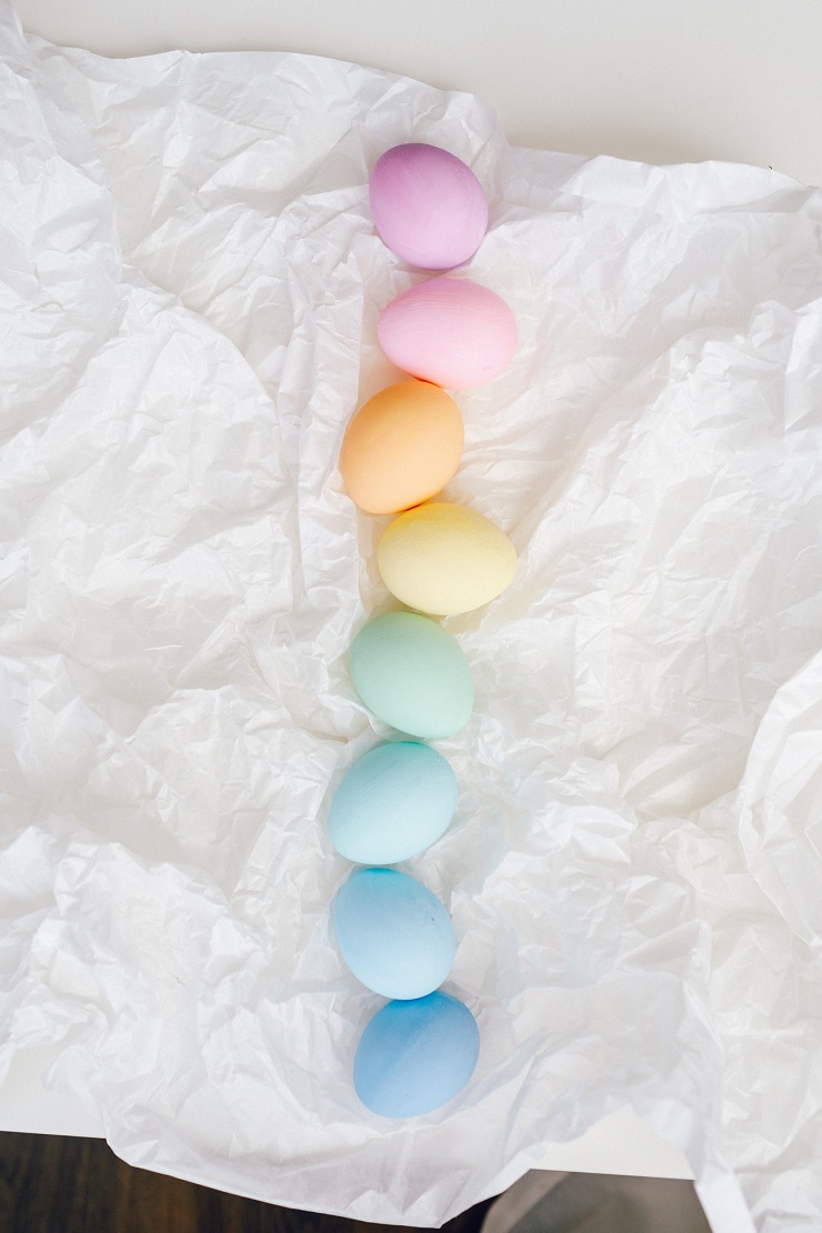 Можете да ползвате и единствено една багра, като тук концепцията е да имате един цвят с друга плътност. Приятно се получава и когато яйцата са боядисани единствено в топлата или единствено в студената гама.