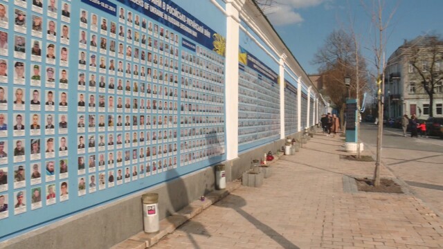 На друга стена на този манастир са сложени фотосите на всички хора, които са починали във войната в Донбас от 2014 година, а празна стена чака фотосите на новите жертви.