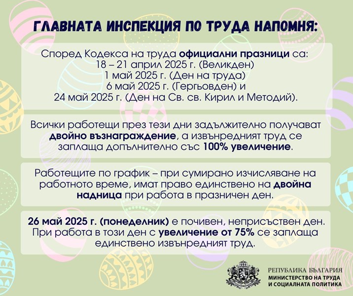 Главната ревизия по труда припомня на всички работодатели и чиновници, че съгласно Кодекса на труда, работата по време на публични празници се заплаща с най-малко двойно заплащане. В случаите, когато полаганият труд е и ексклузивен, работодателят дължи в допълнение 100% нарастване на заплащането.