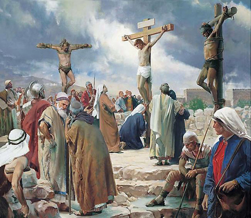 На лобното място Христос е прикрепен към Кръста и разпнат сред двама нарушители. " Беше третият час и Го разпнаха. Имаше надпис за виновността Му: Цар юдейски. С Него разпнаха и двама разбойници, единият отдясно Нему, а другият отляво. И се сбъдна Писанието, което споделя: " и към беззаконници бе присъединен " /Марк, 15:25-28/