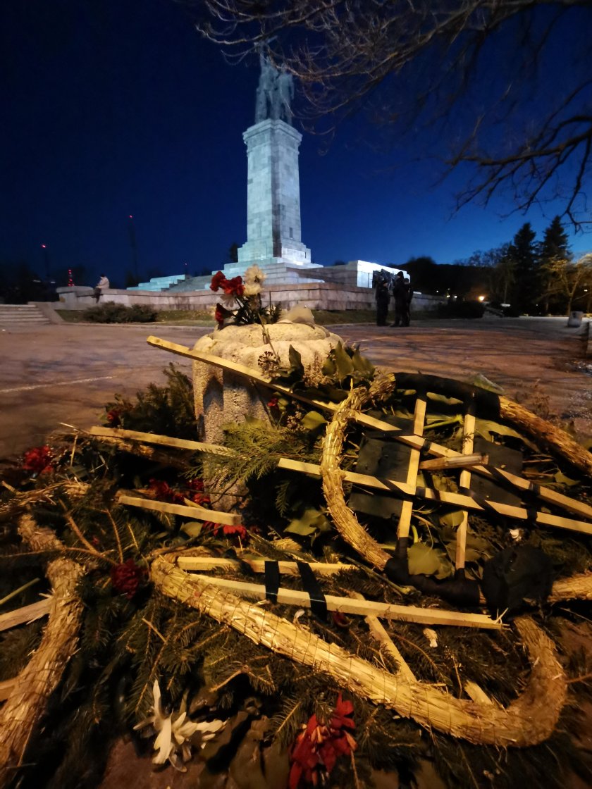 Венците и цветята, които през вчерашния ден съветският дипломат у нас Елеонора Митрофанова и дипломати от съветското посолство сложиха пред паметника на Съветската войска в центъра на София, през днешния ден бяха изхвърлени от протестиращи против съветската инвазия в Украйна. Демонстрацията се организира довечера и бе в поддръжка на украинския народ.