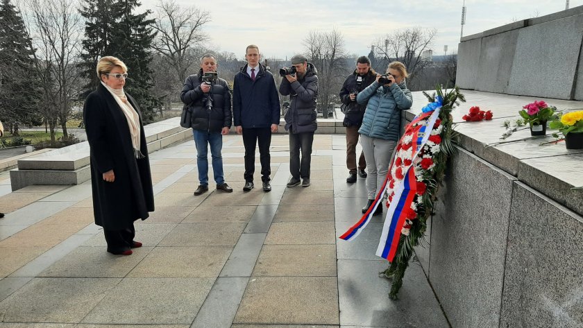 Посланик Елеонора Митрофанова, съветски дипломати и русофили поставиха на 23 февруари венци и цветя пред паметника на Съветската войска в София във връзка съветския празник Ден на бранителя на отечеството