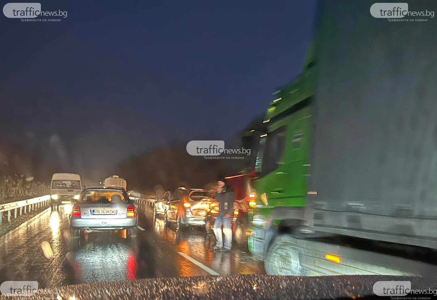 Вероятна причина за катастрофата е неспазване на отдалеченост и несъобразяване с пътните условия. Към момента няма данни за потърпевши, образувало се е запушване.