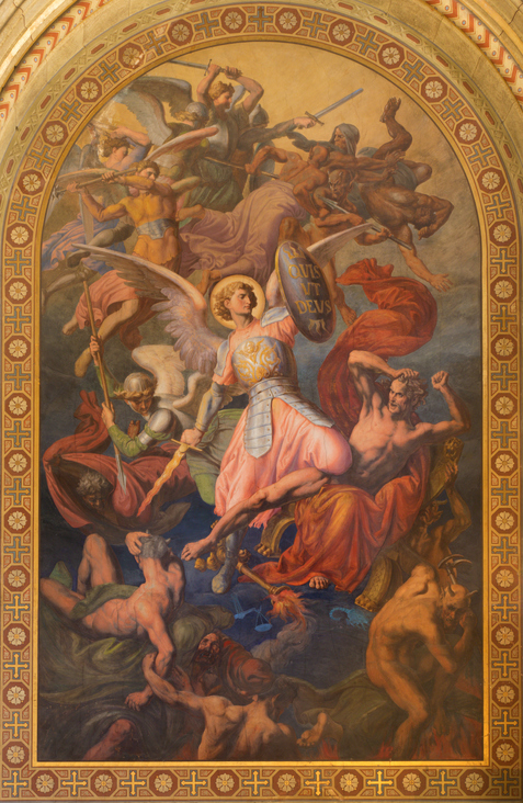 „ И стана война на небесата: излязоха Михаил и неговите ангели да водят война срещу змея; и змеят води война дружно със своите ангели; обаче те не надделяха, нито се откри към този момент място за тях на небето. И беше свален огромният дракон, онази старовременна змия, която се назовава Дявол и Сатана, който мами целия свят; свален беше на Земята, свалени бяха и ангелите му дружно с него. “