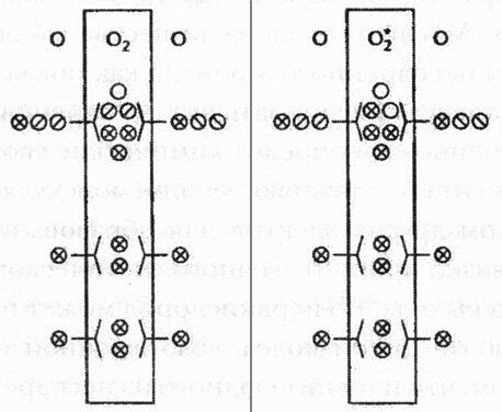Запълване на електронните орбитали в молекулата на кислорода: (вляво) в главно положение ( " естествен " кислород); (вдясно) във възбудено положение ( " синглетен О2 " ). Кръстчетата са двойки електрони, а диагоналните линии - единични електрони. Кръговете са електронни орбитали, а празните кръгове са незаети орбитали. Според правилото на Хунд електроните първо запълват всички орбитали с несъмнено енергийно равнище (показано на едно ниво) и едвам откакто всички празни орбитали са запълнени, се образуват електронни двойки. Ето за какво атомният О2 (показан странично във всеки случай) съдържа два несдвоени електрона. Когато електронните орбитали се сливат при образуването на кислородна молекула, се ползва същото предписание, тъй че кислородът в главно положение има два несдвоени електрона с паралелни спинове. Поради това кислородът може да одобри единствено по един електрон с антипаралелни спинове, което води до двойки електрони. В синглетния О2 един от несдвоените електрони, нарушавайки правилото на Хунд, трансформира посоката на спина и се свързва с втори електрон, освобождавайки нискоенергийна орбитала. Ето за какво синглетният О2 е доста реактивен.
