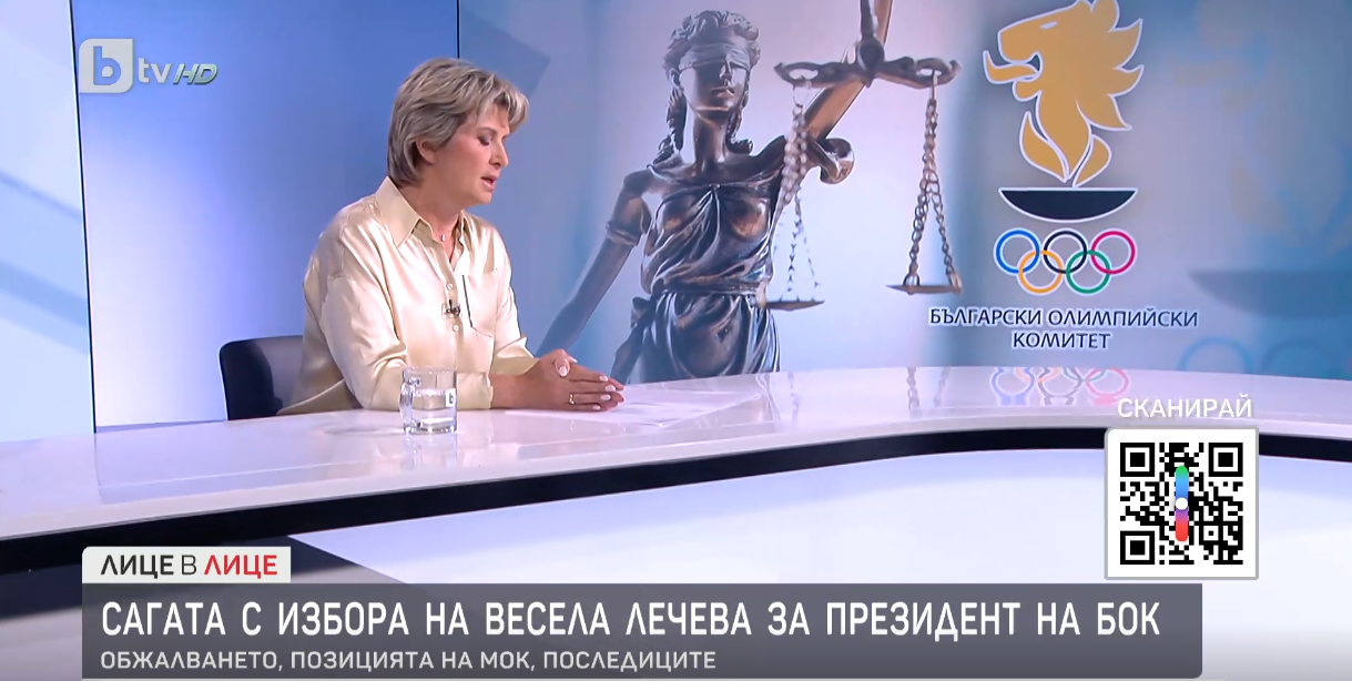 МОК разполага с дирекции и адвокати от извънредно висок сан. Те употребяват и мнения на интернационалните правни адвокатски фирми, които са извънредно авторитетни. В МОК не могат да си разрешат да се опират единствено на написано и казано нещо по българските медии. Те са срещат доста съответно с документите, които се дават от самото Общо заседание на БОК, и въз основата на тях те взимат своето дефинитивно решение, съобщи още по бТВ Весела Лечева.