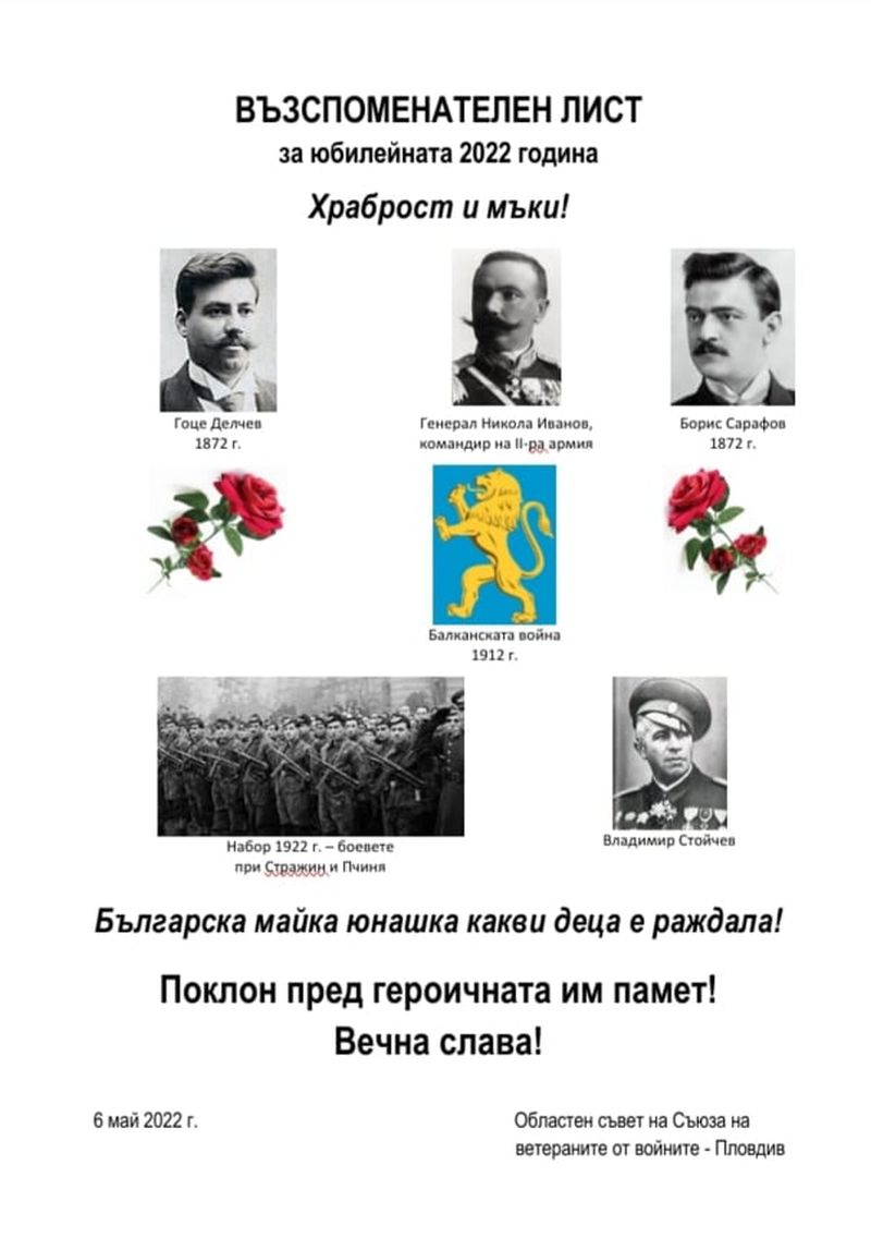 В клуба на ветераните от войните пред потомците на Съюза на ветераните от войните ще се организира кръгла маса на тематика 150 години от рождението на Гоце Делчев и Борис Сарафов, 100 години от набор 1922-ри, взели участие във Втората международна война.