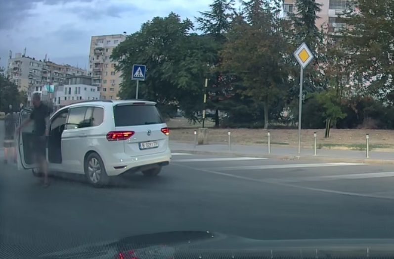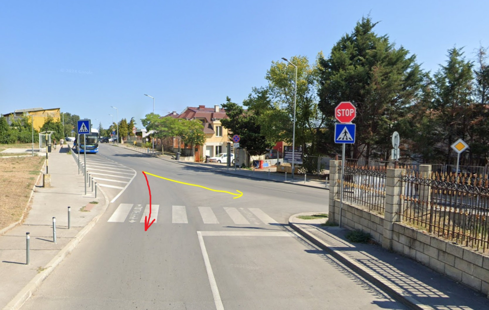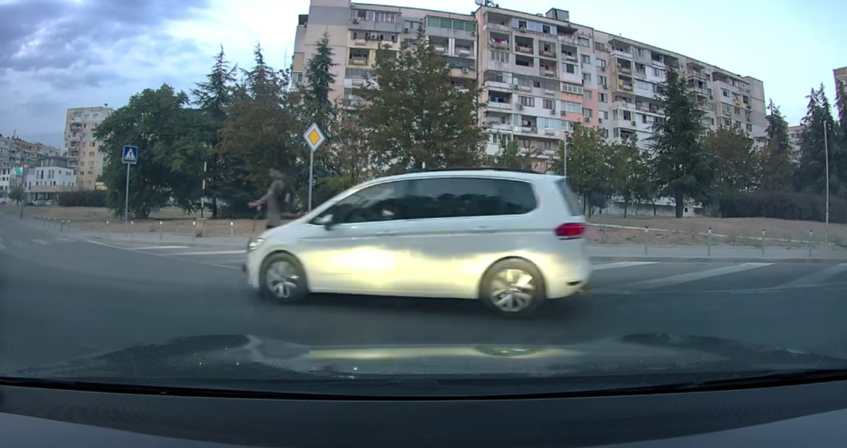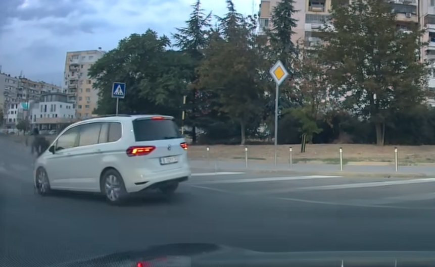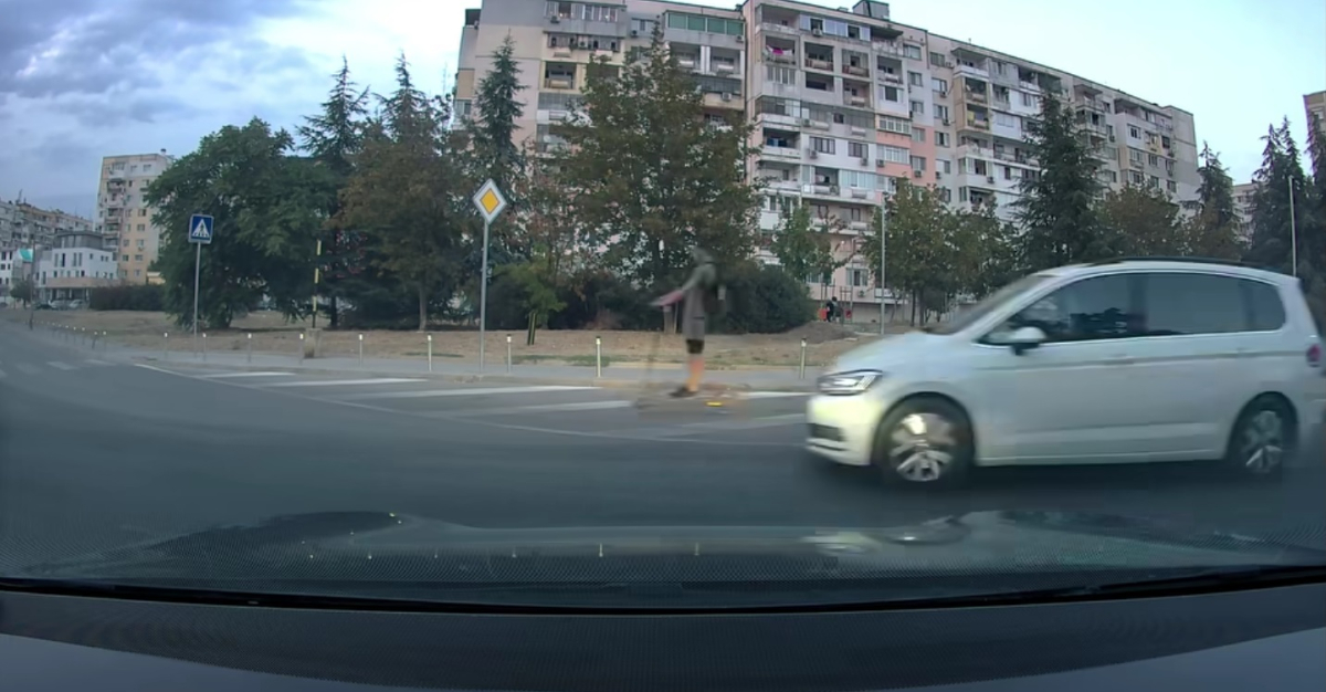 До случая се стига, след като момчето с тротинетката, задаващо се от дясната посока на снимащия, минава през пътен остров за да продължи напряко, а през това време от същата посока се задава и кола, която ще прави десен завой.