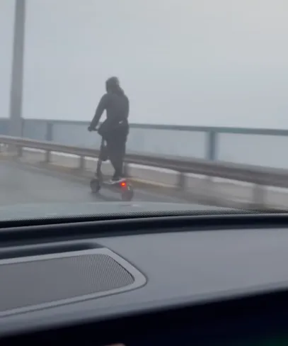 Тротинеткаджия в мъглата на Аспаруховия мост възмути шофьорите СНИМКИ