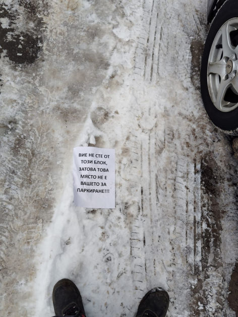 „ Вие не сте от този блок, по тази причина това място, не е вашето за паркиране “. Това обръщение се появи отпечатано на лист в София. В квартал „ Люлин “ гражданин има рекламация за паркомясто. Оставяйки бележката на автомобил, той желае да уведоми, че не утвърждава живущи в други здания да паркират пред неговия блок. Но има ли право?