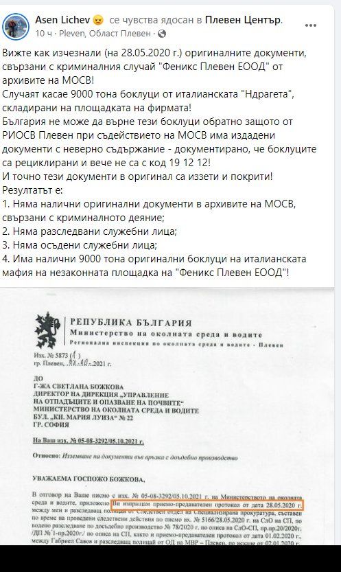 “Вижте по какъв начин са изчезнали на 28 май 2020 година истинските документи, свързани с престъпния случай „ Феникс Плевен ЕООД “ от архивите на Министерство на околната среда и водите. Случаят касае 9000 тона отпадъци от италианската „ Ндрагета “, складирани на площадката на компанията “. Това разгласи някогашния длъжностен министър на околната среда Асен Личев в своя профил във Facebook.