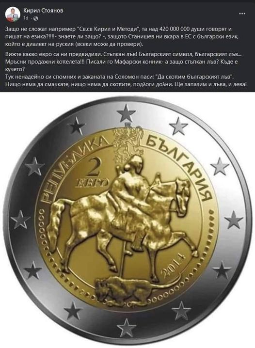Най-компетентните специалисти по парична политика в България - събирачите на подписи за референдум против еврото от метростанция " Дружба " - разкриват сатанинския план на Европейски Съюз, заплетен още преди 15 години с брашно от насекоми и сок от 5G. " Защо не сложат да вземем за пример " Св. св. Кирил и Методи ", та над 420 000 000 души приказват и пишат на езика?!!!! Защото Станишев ни вкара в Европейски Съюз с български език, който е акцент на съветския (всеки може да провери) ", изяснява Кирил Стоянов с присъщата убеденост на човек, който самичък си преценява в тоя живот.