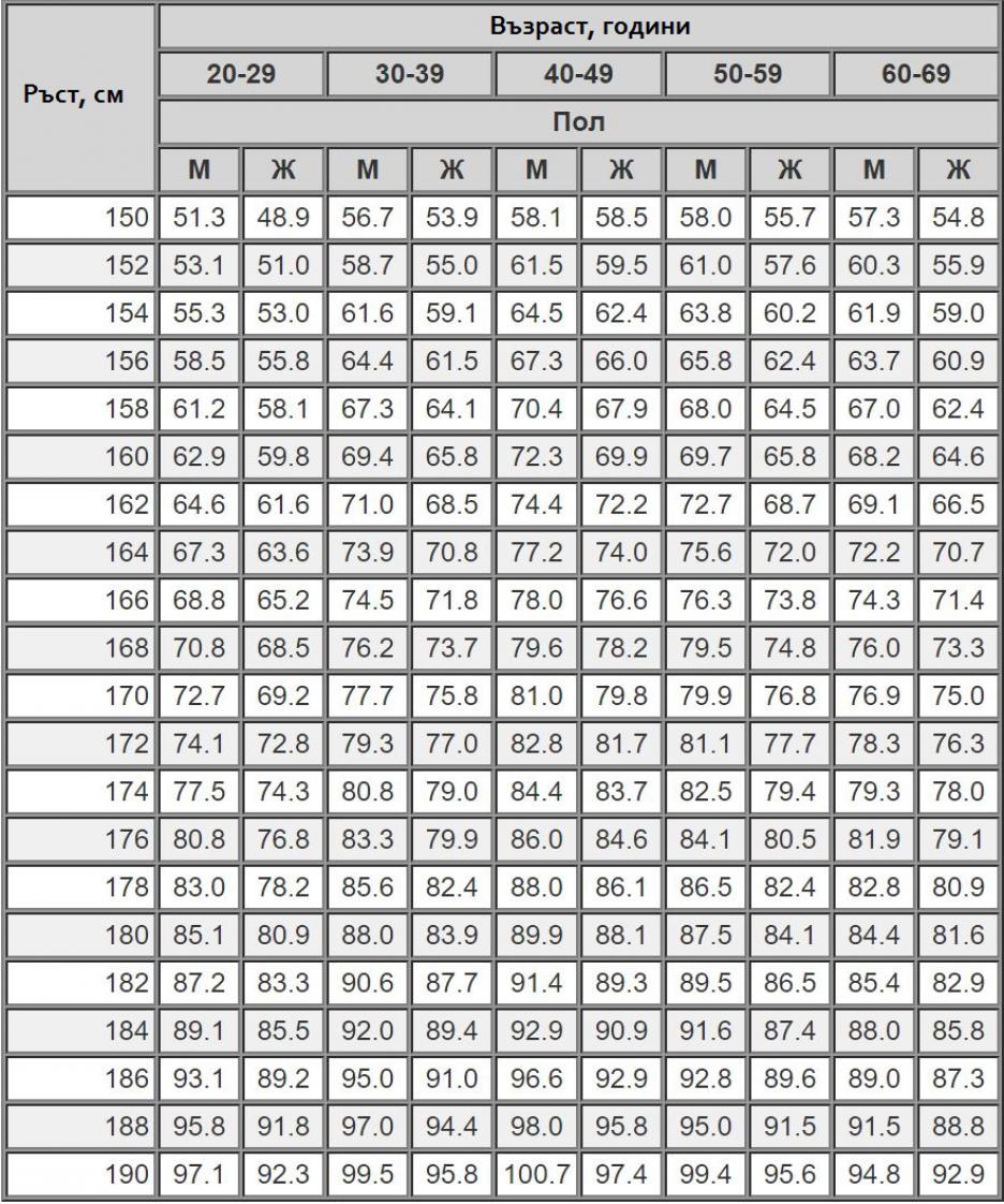 Доказано е научно, че и мъжете, и дамите стартират да натрупат килограми с възрастта. Това е естествен физиологичен развой. Съответно – не всички килограми по вас могат да се смятат за „ непотребни “. За да получите по-прецизно пресмятане на съотношението тегло-ръст, използвайте следната формула: Р е вашият растеж (в сантиметри). Г са годините ви. Телесната маса е = 50 + 0,75 (Р – 150) + (Г – 20): 4.