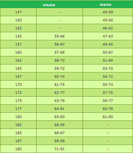 Трябва да имате поради, че хората с телосложение вид астеничен би трябвало да понижат тази стойност с 10 %. Същевременно, тези които са хиперстеници – да я усилят с 10 %. Третият вид е нормостеници (нормален), при него цената остава непроменена.