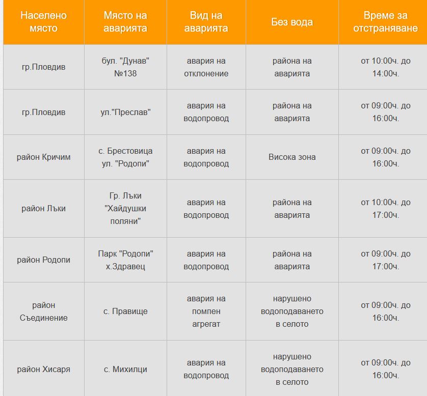 Авария на отклоняване е оставила без вода пловдивчани в региона на бул. " Дунав " 138. Проблем с тръбопровод е оставил на изсъхнало и жители в региона на ул. " Преслав ". От ВиК предвиждат, че повредите ще бъдат отстранени от 10 до 14 часа и от 9 до 16 часа.