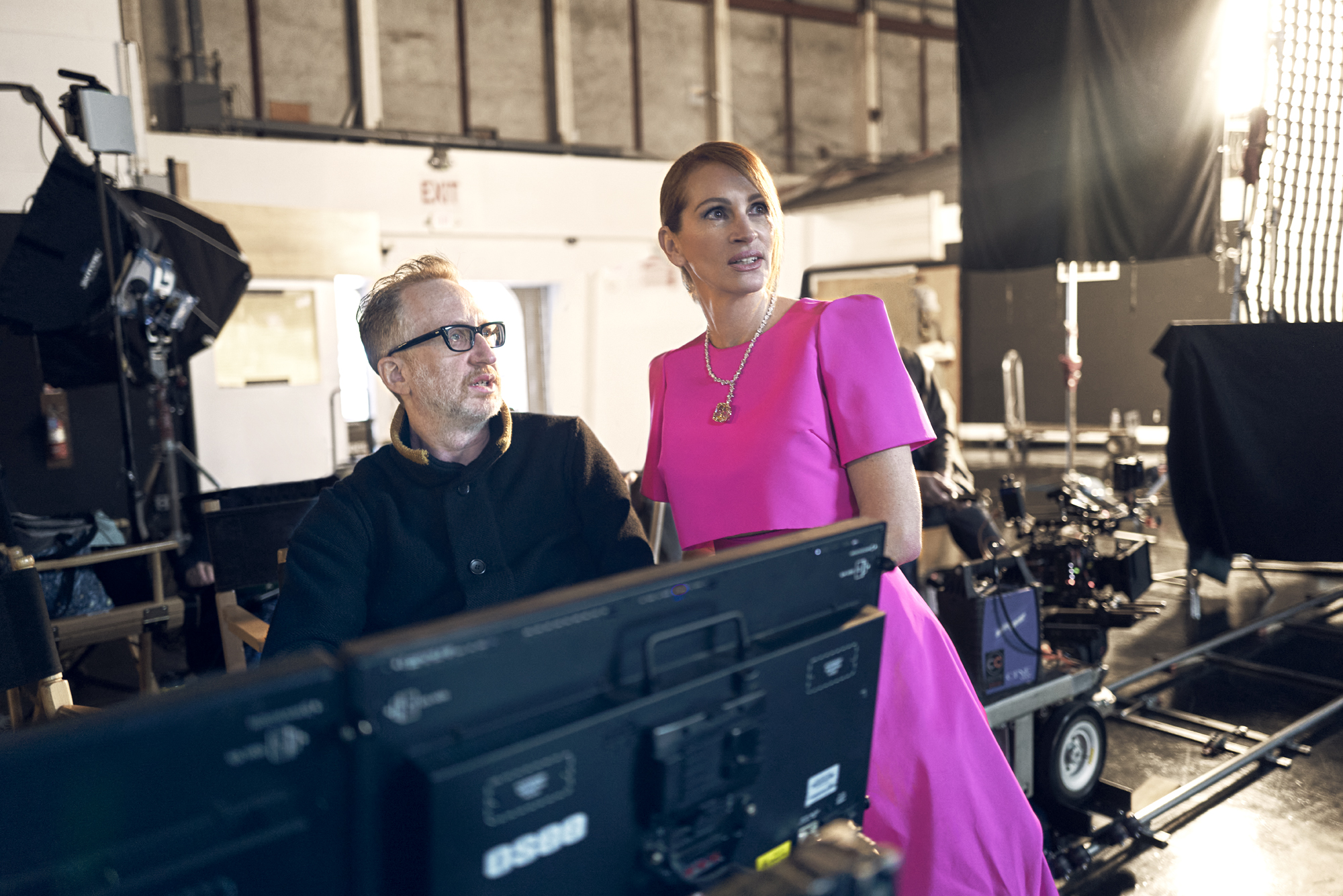 Каква е Джулия Робъртс в деяние? Такава, каквото всички сме си я представяли. Не стопира да се майтапи, а звънкият й смях оглася пространството. Намира да каже по нещо хубаво на всеки, нахлузва кецове под блестящите си рокли, сама взима камерата или прекъсва подготовката, с цел да гушне кучето си.Запечатвайки тези откраднати моменти, Джеймс Грей демонстрира пред камерата какво се случва зад кулисите, какво става сред репликите и повторенията. Всички дребни случки, които в действителност вдъхват живот и магия на филмите, в които Джулия Робъртс е толкоз сполучлива. Украсена и уверена с бижутата си Chopard, тя внася своята харизма на снимачната площадка.