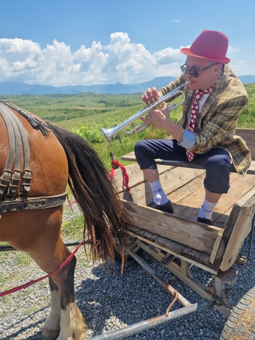Виртуозният тромпетист Йордан Йончев - Гъмзата развесели почитателите си в дъждовния вторник. Подчиненият на Слави Трифонов пусна занимателен кадър по какъв начин свири под опашката на кон, видя Lupa.bg.
