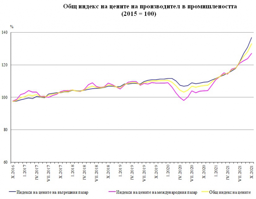 Индексът на цените на производител на вътрешния пазар през октомври 2021 година нараства с 25.2% в съпоставяне със същия месец на 2020 година. Повишение на цените е записано при производството и разпределението на електрическа и топлоенергия и газ с 43.4%, в добивната индустрия - с 19.1%, и в преработващата индустрия - с 14.6%.