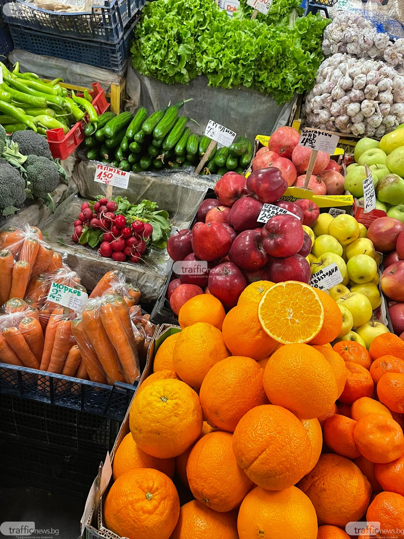 Стойността на доматите и на двата пазара е съвсем идентична – междинната им цена е 6-6,50 лева за кг. Драстични разлики в цените и на останалите артикули няма – морковите са на цена от 2 лева./кг., ябълките – 3,50 лева./кг., картофите – към 2 лева./кг. Покачване има и в цените на чушките. Червените чушки са достигнали цена от 5 лева./кг., а тези вид „ Калифорния ” – 6 лева./кг.