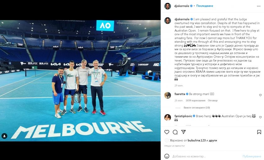 " Щастлив и признателен съм, че съдиите анулираха решението за отменяне на визата ми. Въпреки всичко, което се случи, желая да остана и да се опитам да вземам участие в " Аустрелиън оупън ". Оставам отдаден на тази мисъл. Дойдох тук, с цел да играя в един от най-важните шампионати пред едни от най-невероятните почитатели ", написа Новак Джокович в Туитър.