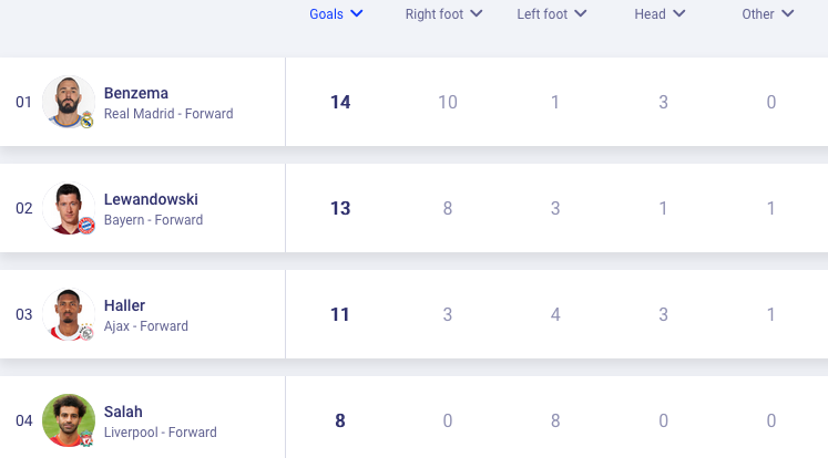На трето място измежду голмайсторите в Шампионската лига е от с 11 точни изстрела, само че и неговият отбор е навън от надпреварата. Четвърти с 8 гола е от.