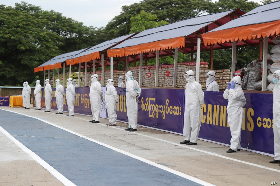 Чувалите със зелено-кафяв канабис бяха подредени високо в квартал на комерсиалната столица Янгон, дружно с торбички с червено-розови хапчета. Мианмар прави този акт на годишно изгаряне по случай Световния ден на опиатите.