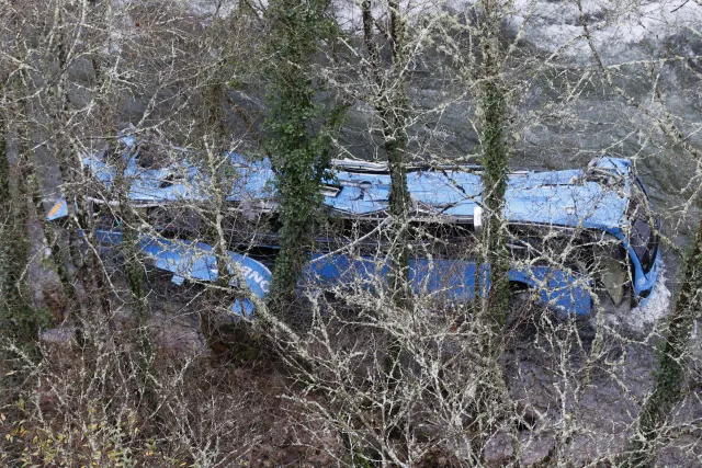 Двама души, в това число водачът, пострадаха, откакто рейсът, пътуващ от Луго за Виго, падна от височина към 30 м в бързо течащата река. Тестовете за алкохол и опиати на лидера на рейса са негативни.
