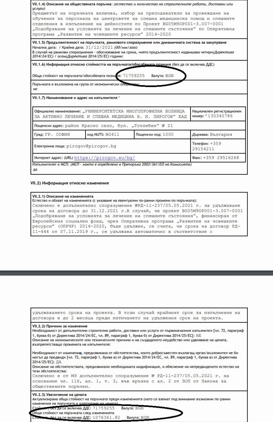 Но в обявлението за изменение като сума по контракта е вписано цифрата 71 759 255 лева (забелязахте ли, че липсва десетичната запетая!? – б. р.)