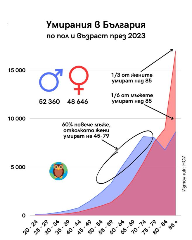 Графиката показва броя умряли през 2023 по полове в разнообразни възрастови групи от 20-годишни нагоре, като тези над 85 са събрани дружно. Според данни на Националния статистически институт към всяка трета жена, умряла през съответната година, е била на възраст над 85, само че едвам към всеки шести мъж. Така достигането на тази възраст се оказва много по-типично за дамите, в сравнение с за мъжете. Същевременно доста по-висок брой мъже в България почиват след 45 и изключително след 60, като тази ранна смъртност смъква и междинната дълготрайност на живота за общата група по пол.