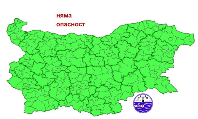 Няма оповестени предупредителни кодове за рискови феномени. Картата на Национален институт по метеорология и хидрология е оцветена в зелено.