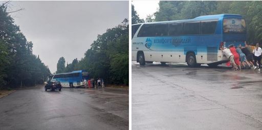 Група мъже и дами бутали голям пътнически рейс. Случката се разиграла някъде в региона на Златни пясъци, твърди Златко Киров.