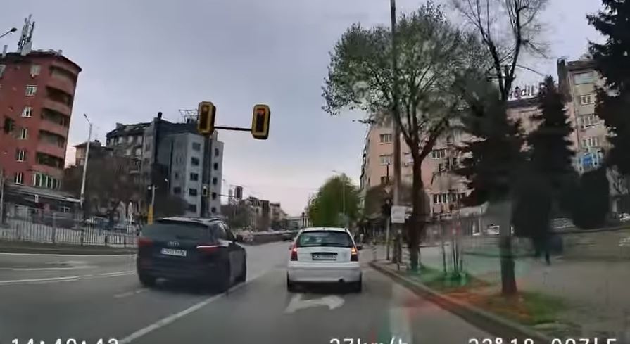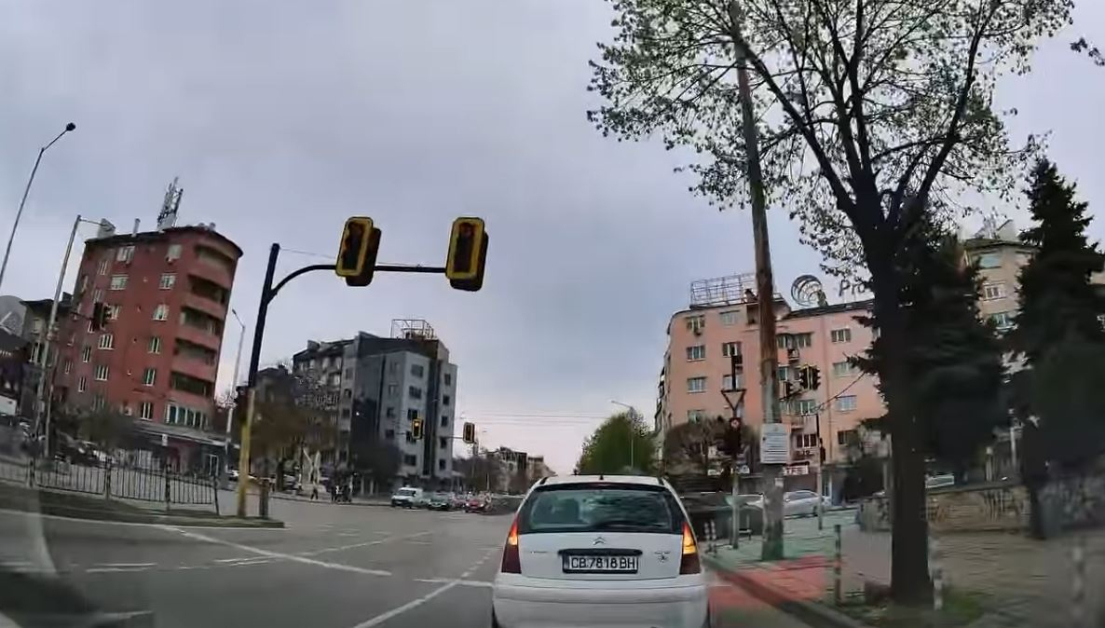Водачът пробва да се престрои в дясната лента, само че не приключва маневрата. Когато стига до светофара на кръстовището, сигналът се трансформира на червен — забранителен за прекосяване.