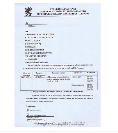 Водата в село Московец е негодна за пиянство. Това излиза наяве от писмо от Регионалната здравна ревизия в Пловдив, оповестено от община Карлово.