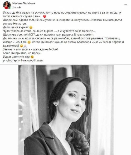 Водещата на новините Невена Василева става следващото известно лице, което си потегля от Нова телевизия , заяви самата тя във фейсбук профила си.